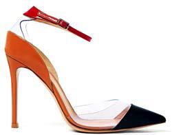 Gianvito Rossi三色尖头高跟鞋,透明质地的鞋面及红、黑、裸三种颜色的搭配,令整个造型活泼又时尚。